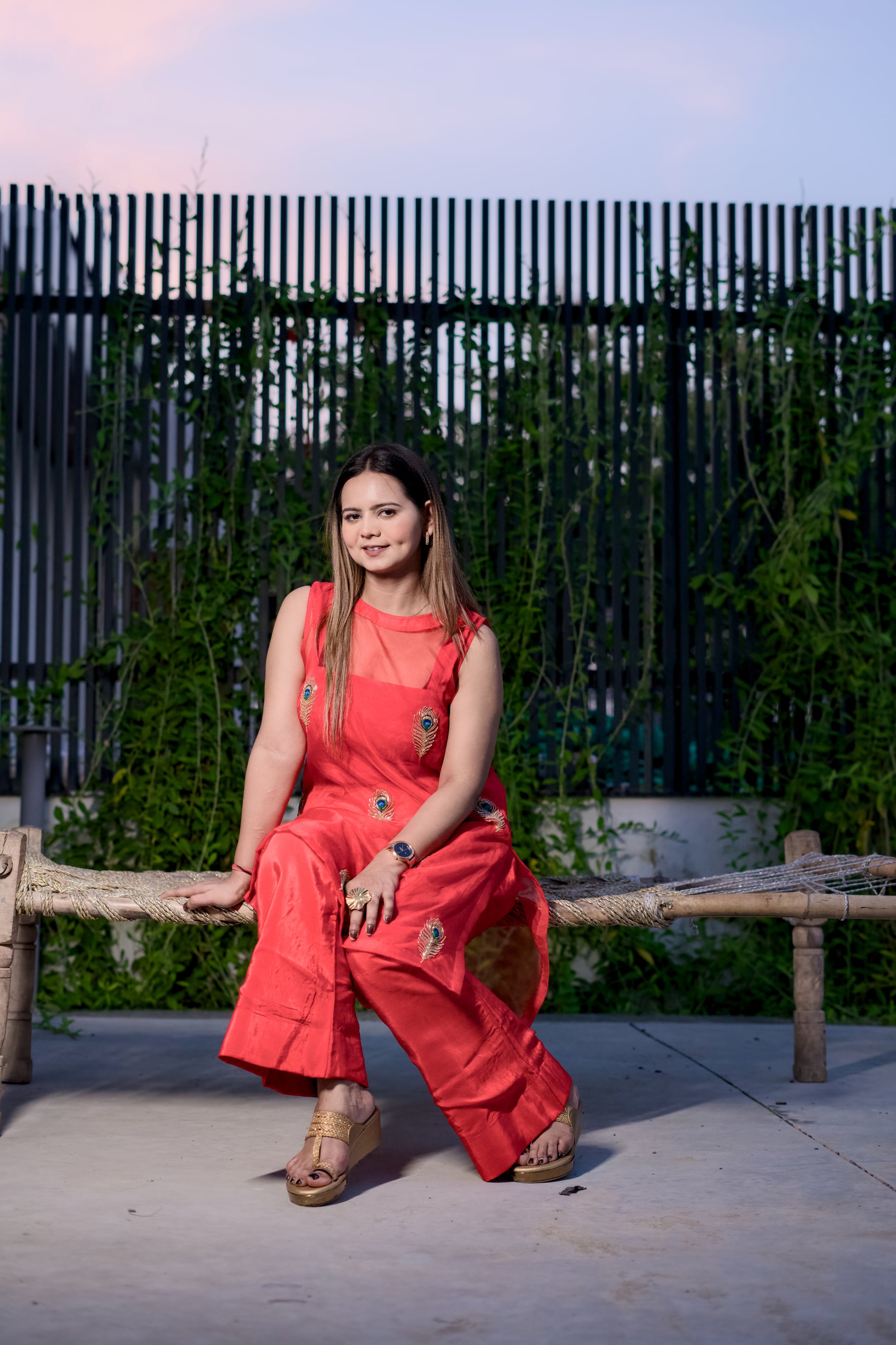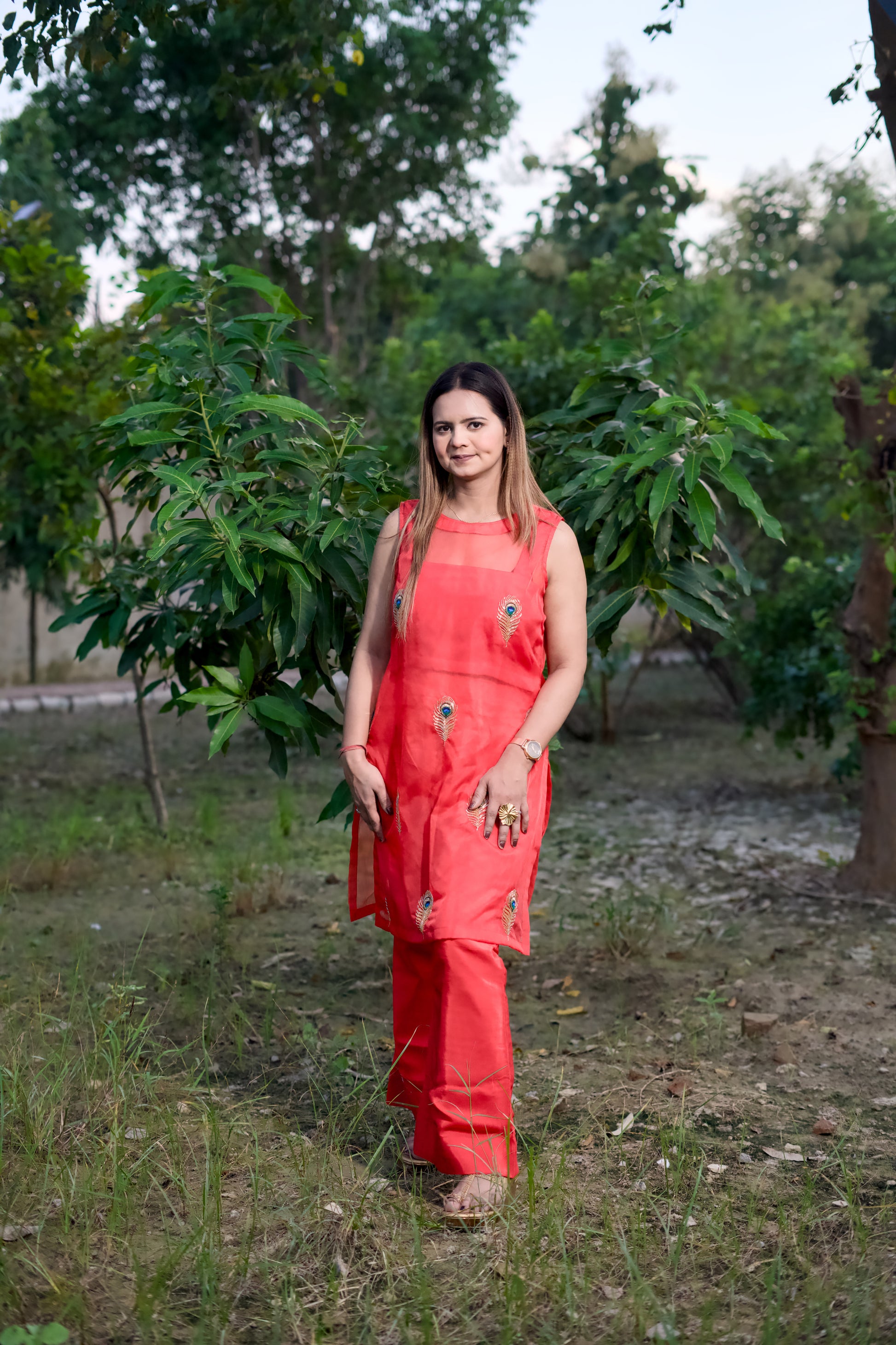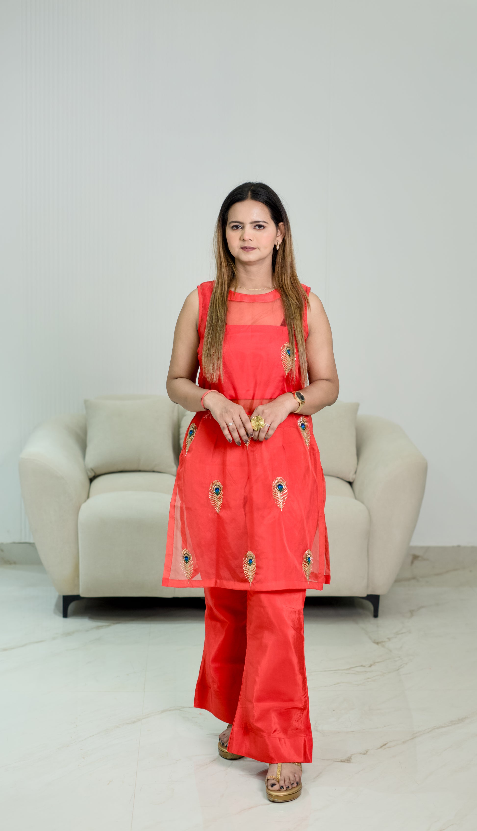 Step into timeless sophistication with our Red Peacock Elegance outfit, a stunning blend of luxury and craftsmanship. The organza shirt is adorned with exquisite handwork, featuring intricate cut dana and delicate bead embellishments that create a graceful, peacock-inspired look.