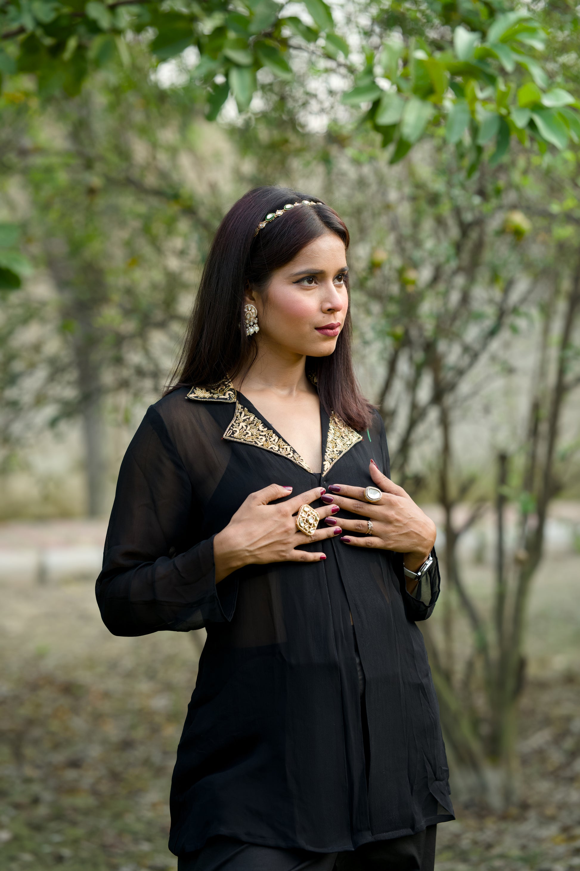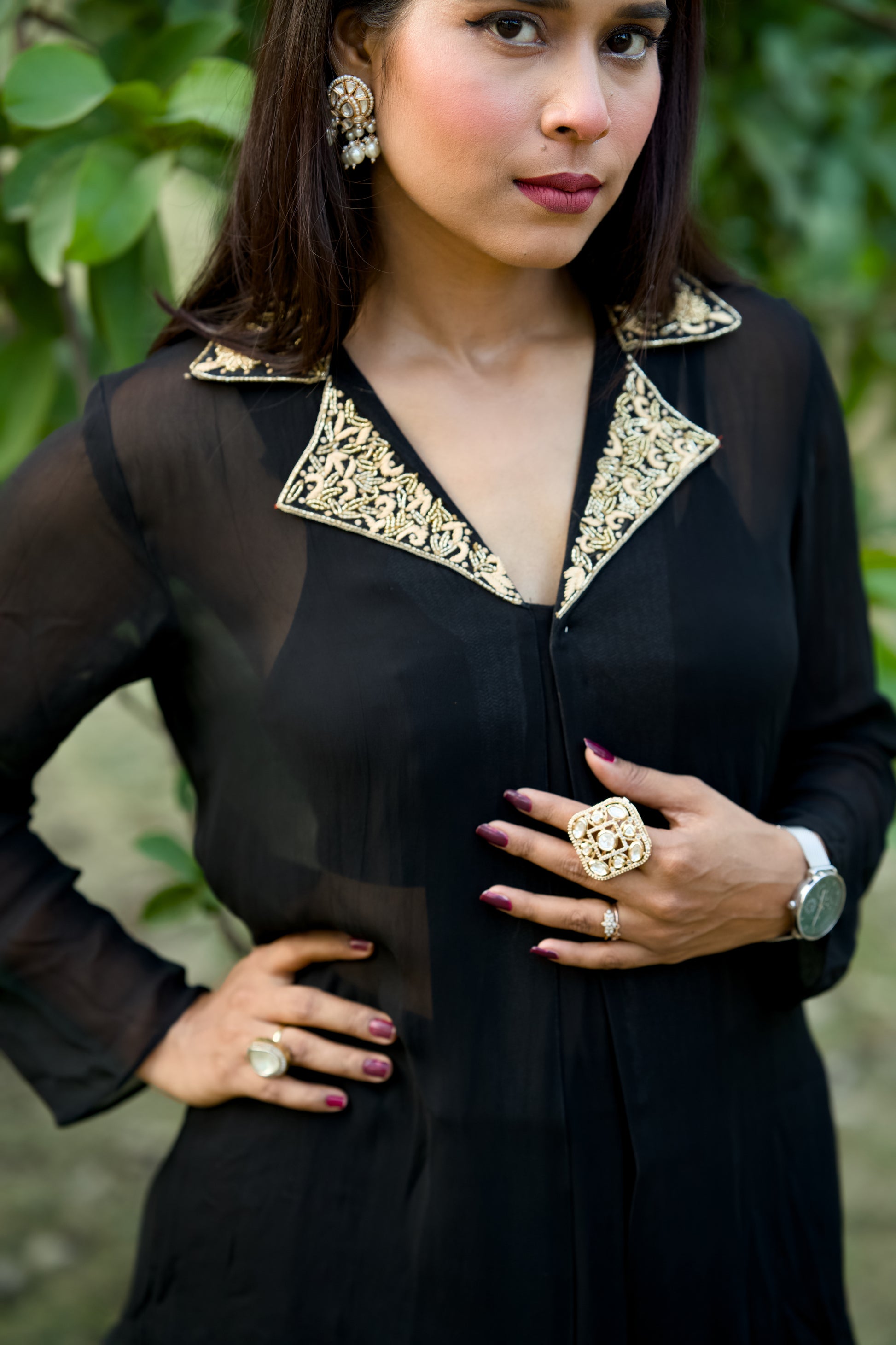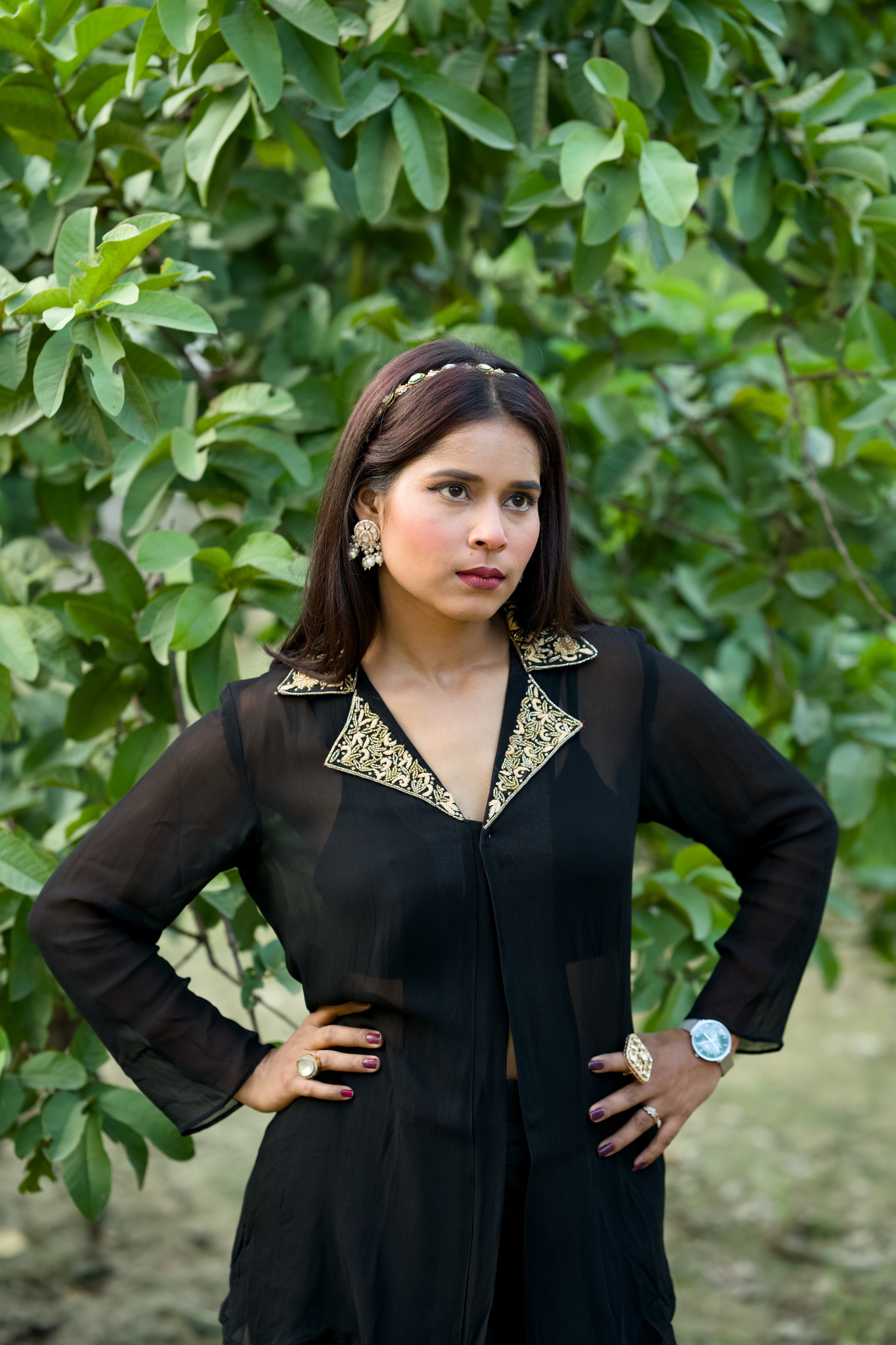 Classic, elegant, and effortlessly stylish — the Black Cord Set is designed to elevate your wardrobe with timeless charm. The georgette shirt drapes beautifully, offering a soft and flowy silhouette, paired with comfortable crepe pants for a refined and modern look.