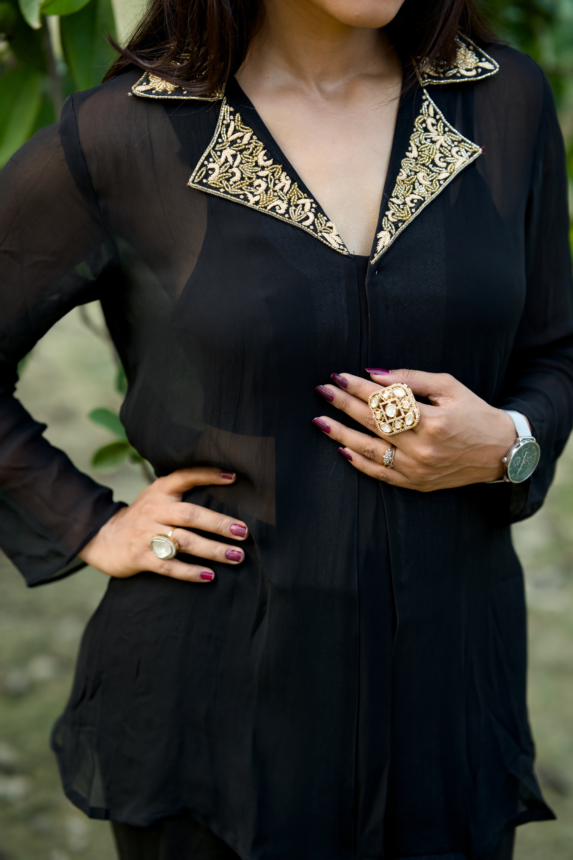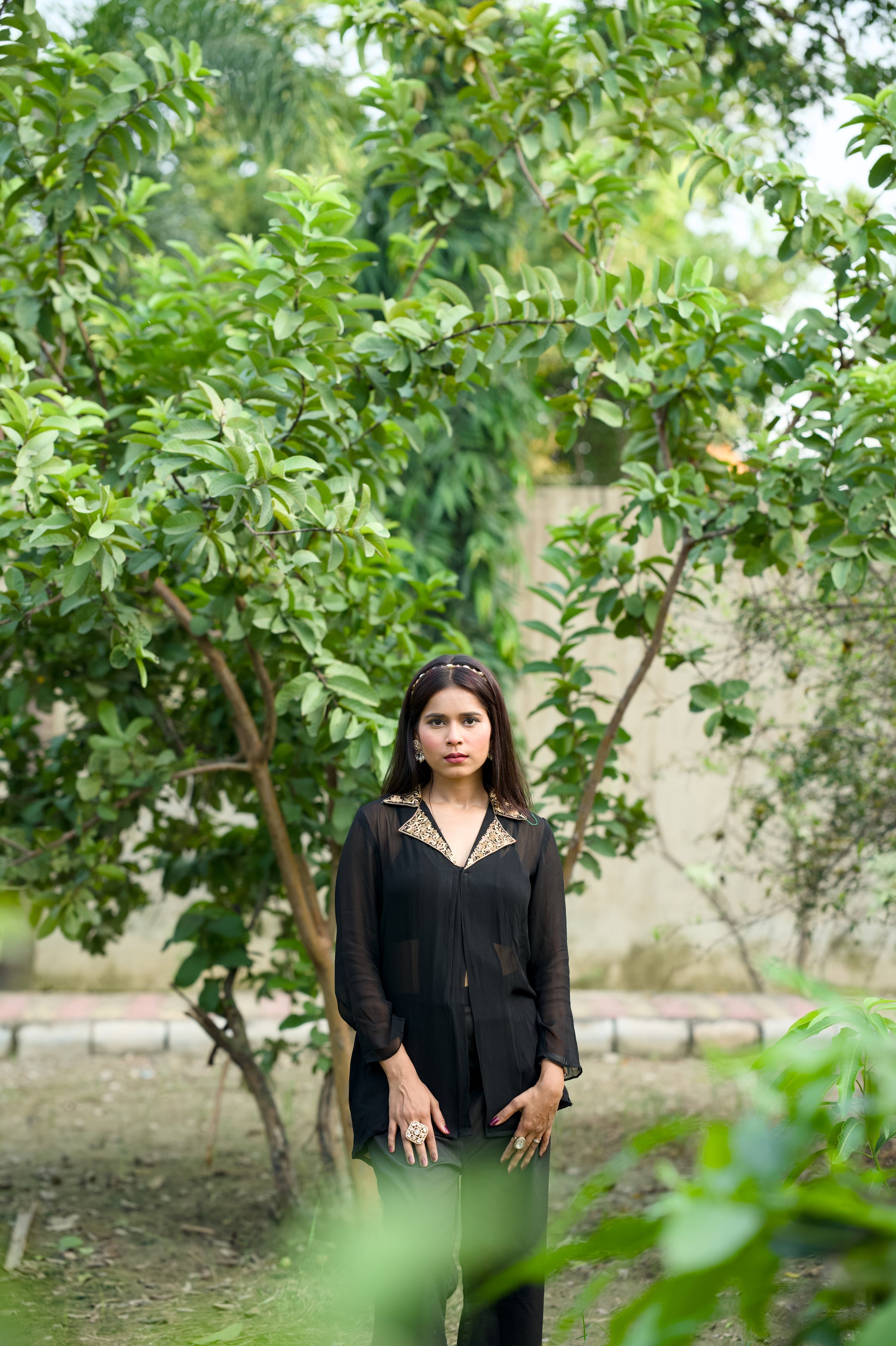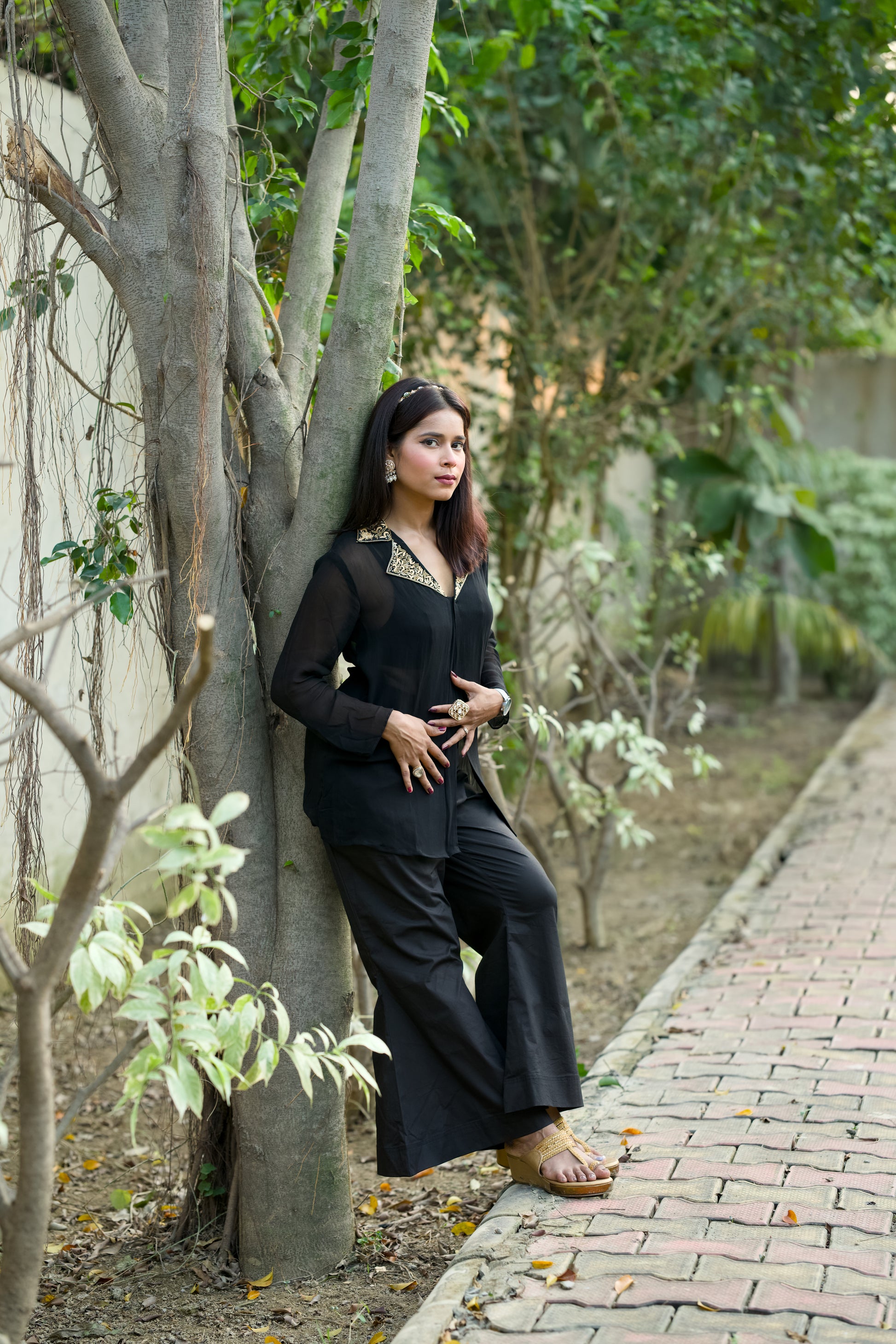 Classic, elegant, and effortlessly stylish — the Black Cord Set is designed to elevate your wardrobe with timeless charm. The georgette shirt drapes beautifully, offering a soft and flowy silhouette, paired with comfortable crepe pants for a refined and modern look.