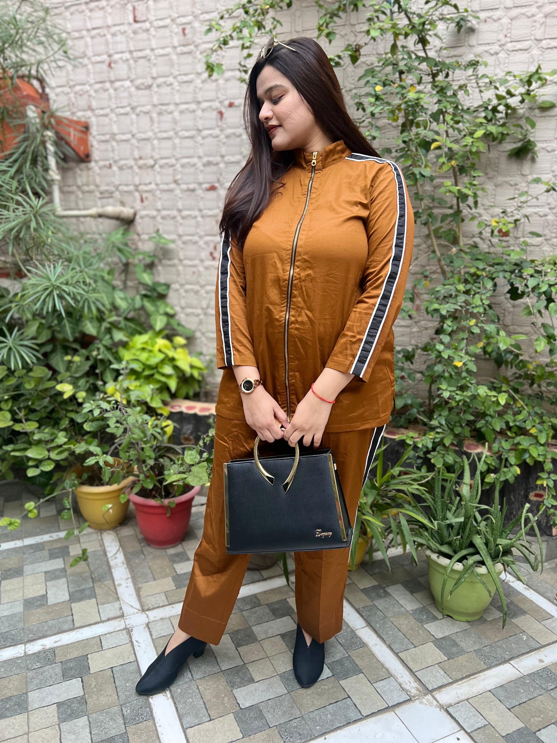 Step into refined style with our Sandstone Chic Cordset, crafted in premium Russian cotton for a smooth, breathable, and structured fit. The rich camel hue paired with sleek contrast stripes on the sleeves and pants adds a modern, sporty-elegant touch. Featuring a front zipper top and relaxed-fit trousers, this coord set offers both comfort and sophistication—perfect for casual outings, office days, or chic travel looks.