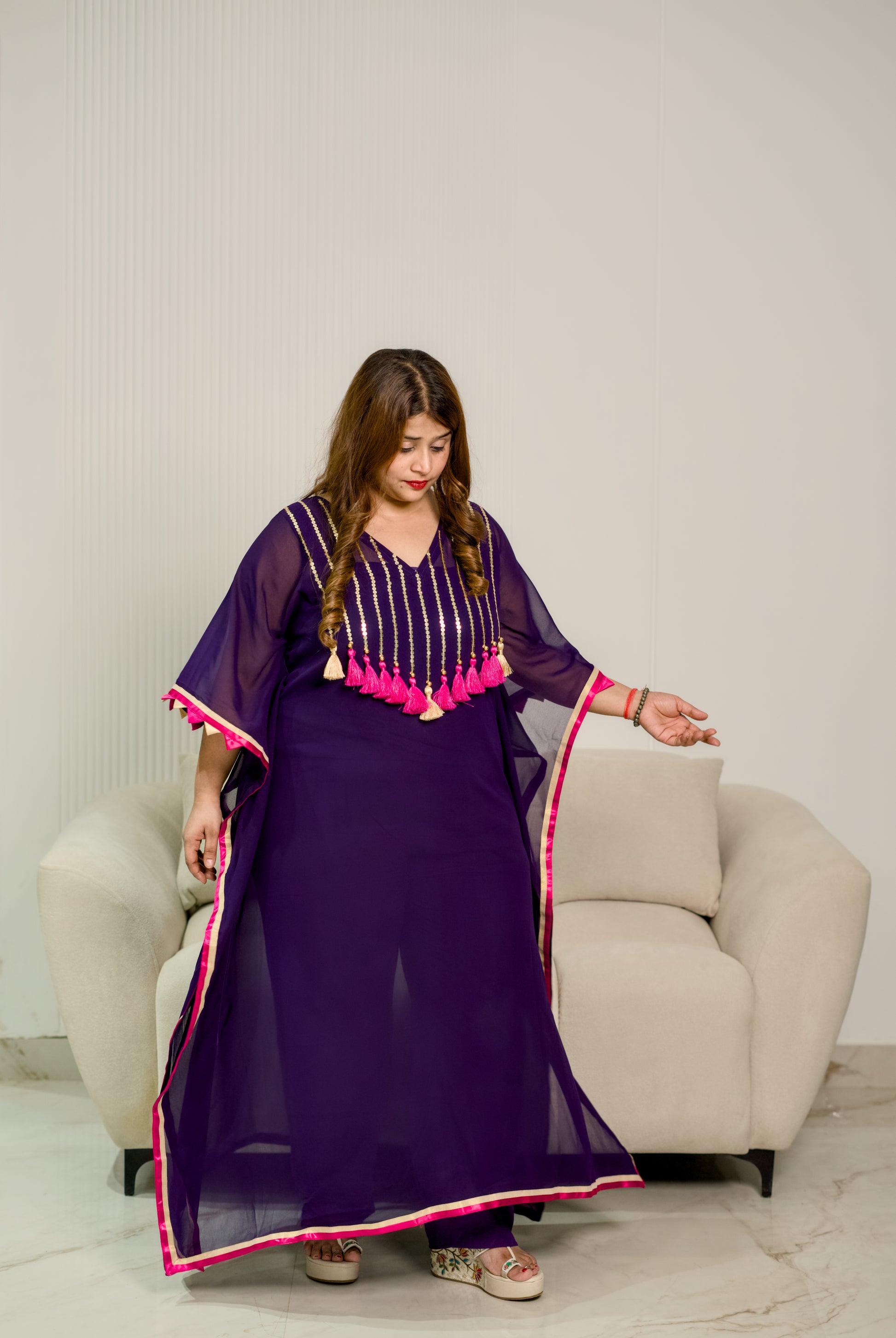 Elevate your style with this beautifully crafted Purple Katan outfit, designed for comfort and elegance. The top is made from soft, flowy georgette fabric, featuring delicate detailing and vibrant tassels that add a festive touch. Paired with flex cotton pants, this ensemble ensures ease of movement while keeping you effortlessly stylish.