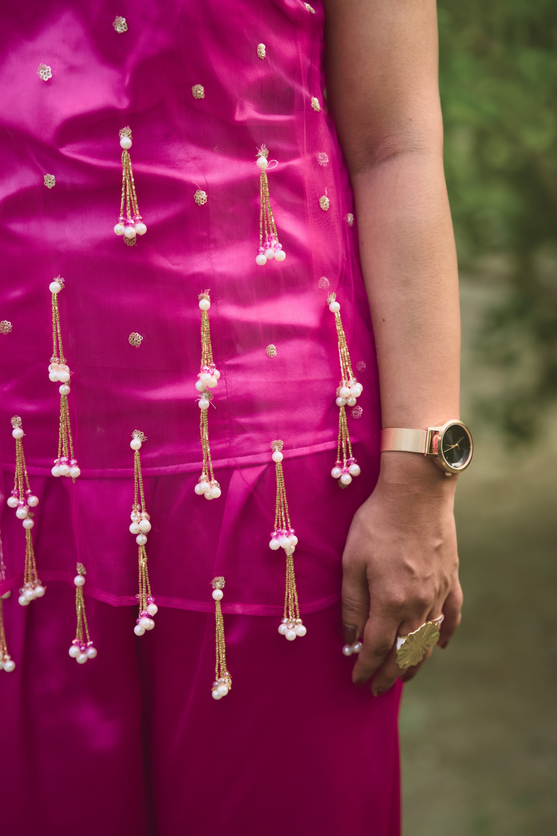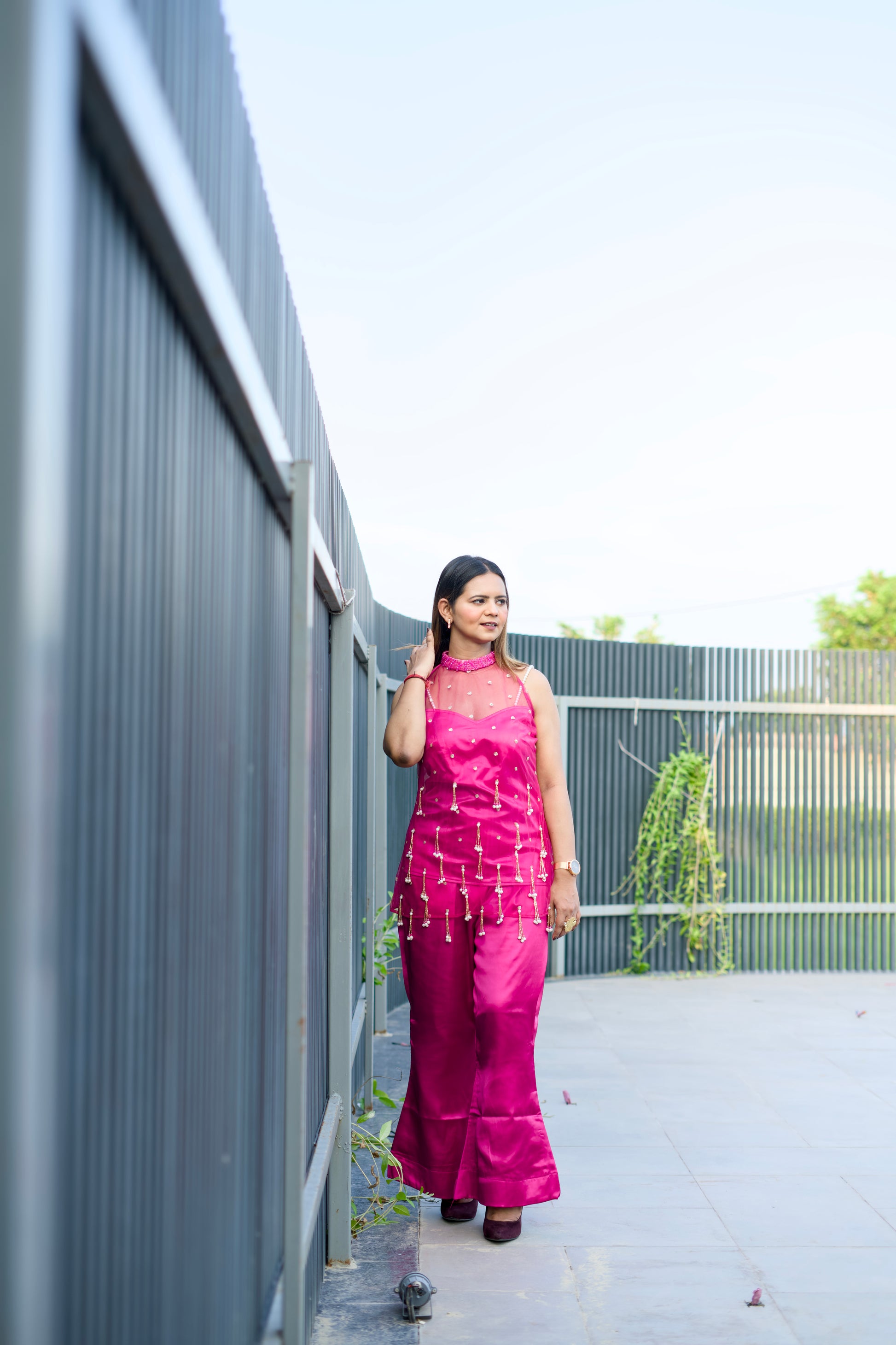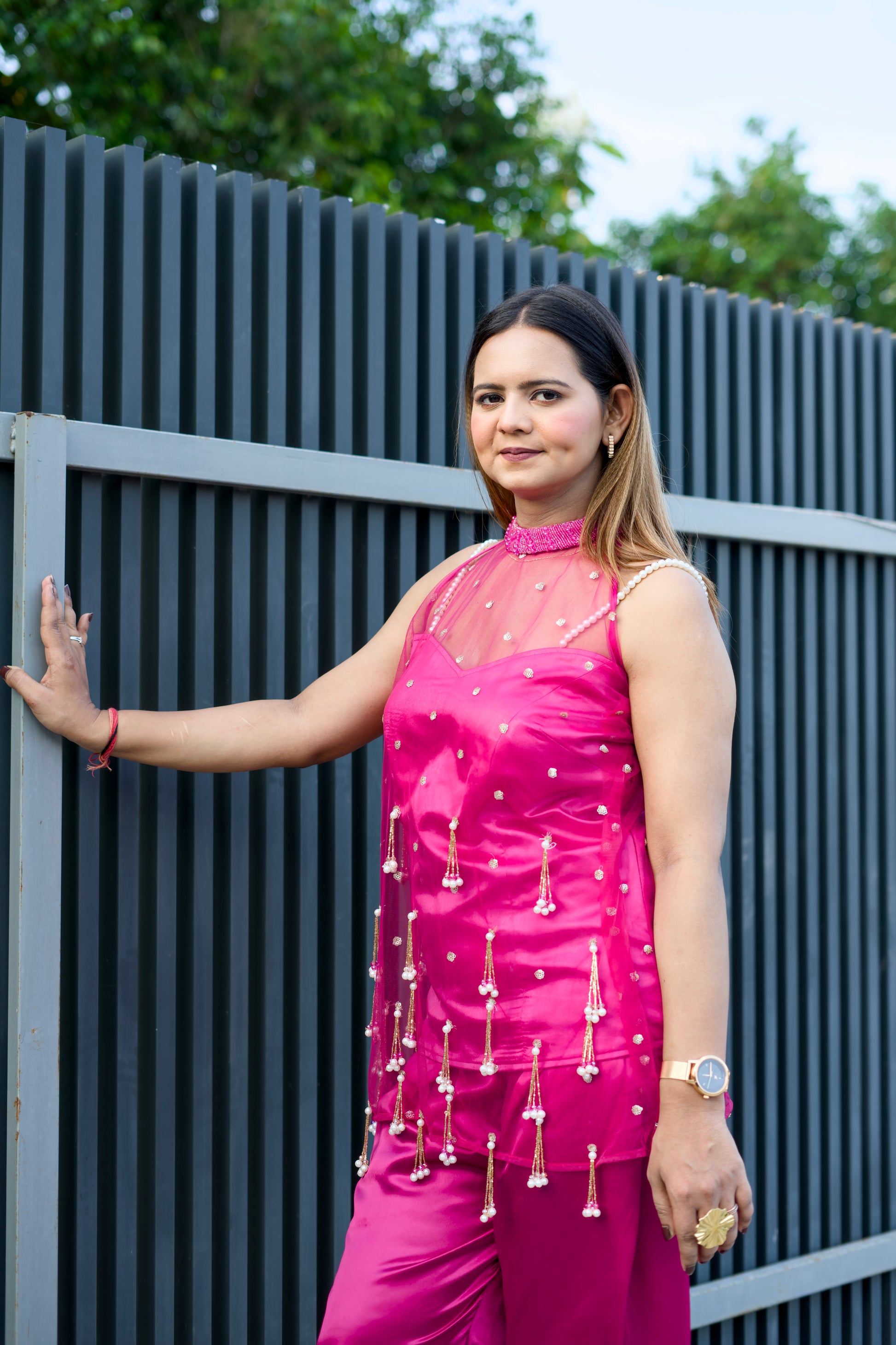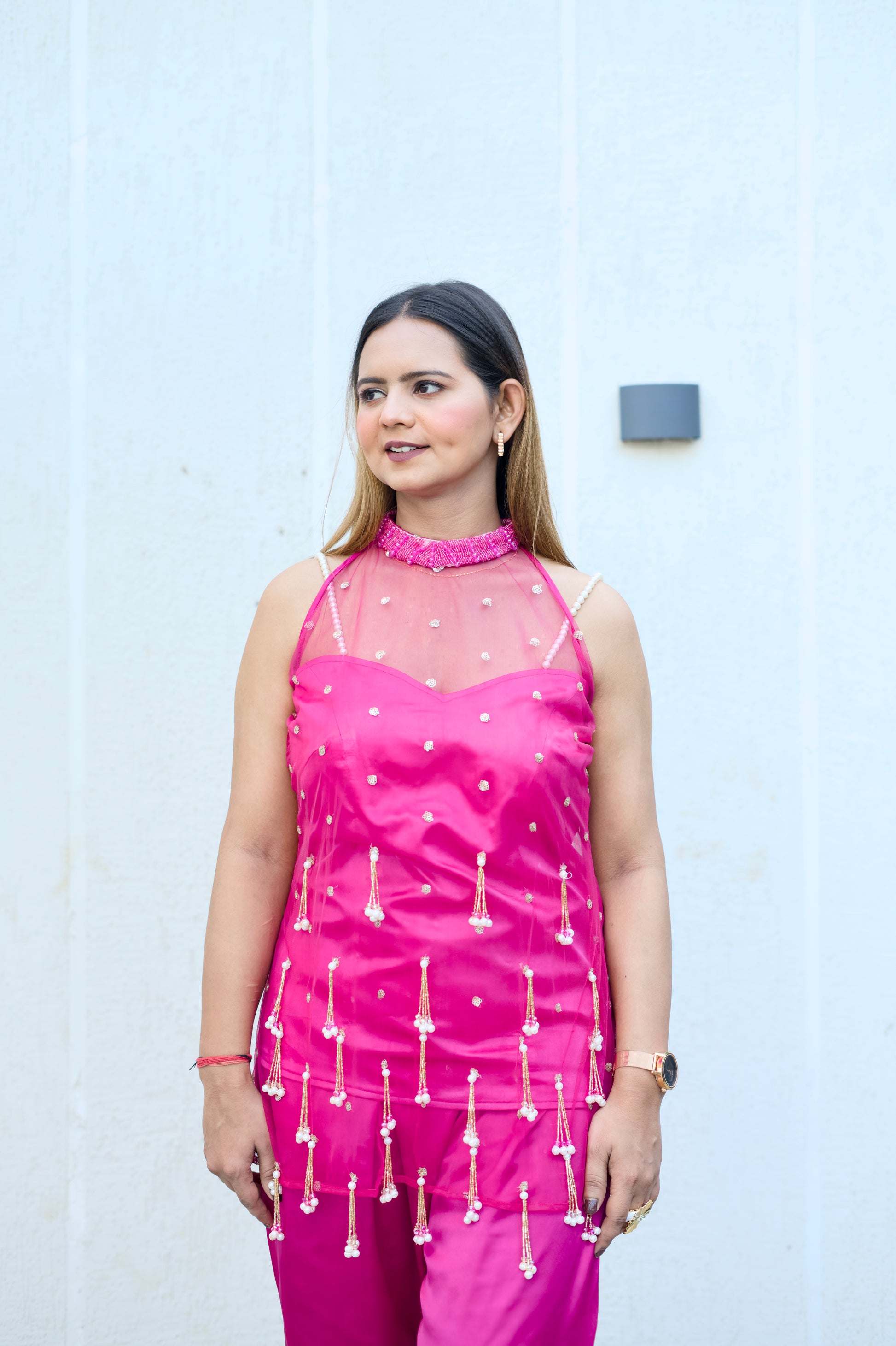 Turn heads with this vibrant hot pink satin co-ord set, designed to bring glam and grace to any festive occasion. The sleeveless halter-style top features a sheer neckline adorned with dainty pearls and playful golden tassels, adding movement and sparkle. Paired with matching wide-leg satin pants, this outfit blends contemporary flair with traditional embellishments. Perfect for weddings, parties, or festive celebrations, this look is made for the modern woman who loves to stand out.